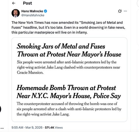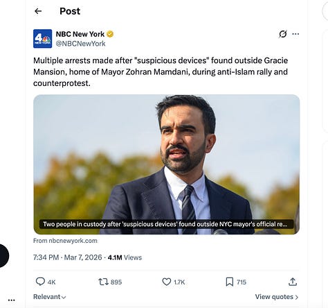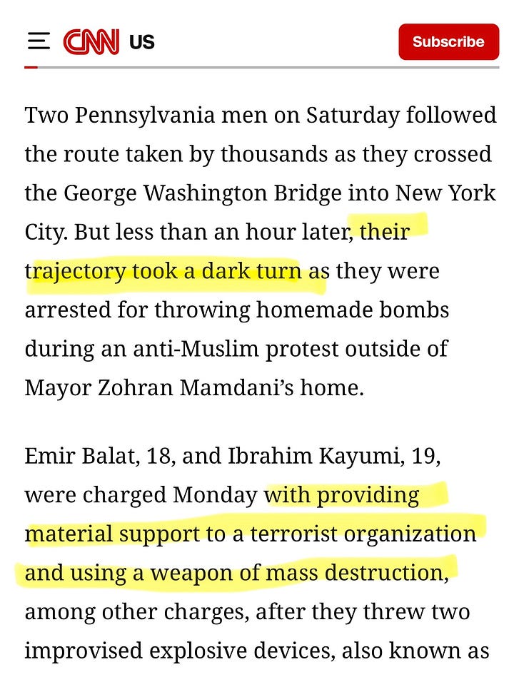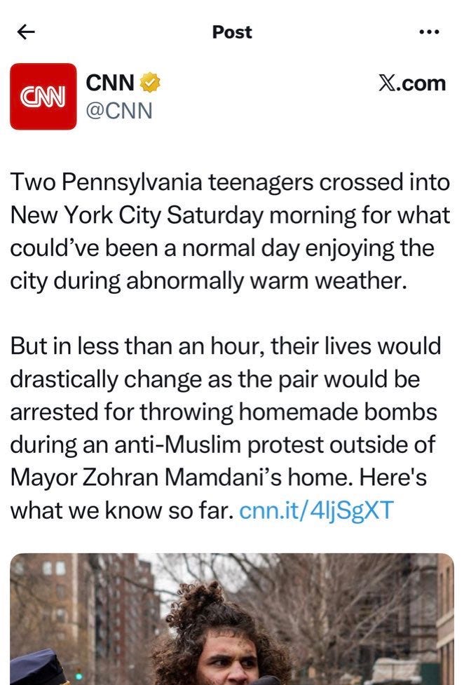 One important fact reliably managed to trip up the press: the motivations of the terrorists. Numerous outlets seemed to imply that the bombs were thrown by the protestors upset about Muslim immigration to New York City, perhaps at the Muslim mayor — despite the quick arrests of the ISIS sympathizers. Axios went with “‘Explosive’ device thrown outside NYC Mayor Mamdani’s residence, NYPD.” CNN’s Edward-Isaac Dovere had to apologize and issue a correction after implying that Mamdani was the target.